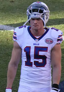 In the 2015 season, Hogan played in all 16 games for the Bills for the third consecutive season. He caught his first touchdown of the season in a win against his former team, the Miami Dolphins, and had his best game on a Monday Night Football game against the New England Patriots, catching six passes for 95 yards.[14] In Week 5, against the Tennessee Titans, Hogan threw his first career NFL pass, a four-yard pass to quarterback Tyrod Taylor. The pass came on a drive that fueled the Bills to a 14–13 win. Hogan also had his first career rushing attempt during the season, which went for four yards.[15] Hogan ended the 2015 season with 36 receptions for a career-high 450 yards and two touchdowns.[16]