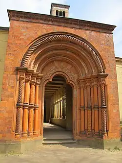 Parallel to the southern arcade runs the cloister with the Heilsbronn Porch, an entrance to the Marly Gardens. It is a replica of a Roman tiered porch at the former refectory in the Heilsbronn Cloister in Middle Franconia, which caught the eye of the architect Ludwig Ferdinand Hesse while he was on a study trip in 1828. He instructed the Berlin potter Tobias Feilner to imitate the entrance in reddish terracotta. Frederick William IV explicitly rejected Hesse's suggestion to incorporate the copy, but Hesse nonetheless had the porch installed two years after the king's death. The original from the Heilsbronn Cloister was brought to the National Germanic Museum in Nuremberg, where it was almost entirely destroyed at the end of the Second World War in 1945.