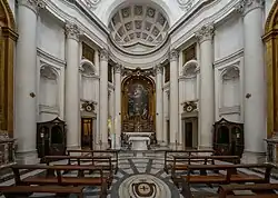 The church interior is both extraordinary and complex. The three principal parts can be identified vertically as the lower order at ground level, the transition zone of the pendentives and the oval coffered dome with its oval lantern.[6]