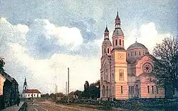 In 1909, as a result of the widening of the Bega Canal, the authorities decided to demolish the church, which stood in the way. This took place in 1913. In 1928, a memorial cross was placed on the site of the altar.[3] Concurrently, the city donated a nearby plot of land for the building of a new church, as well as 60 thousand kronen.[1] Several authors cite László Székely as the architect,[4] but records of the parish council indicate this was Ion Niga of Szeged.[5] The diocese of Arad intervened on the architecture through Paul Rozvan on 16 February 1909, who modified the original plan by "lowering" the central dome and raising the two towers on the western side as compensation.[2] Construction began in May 1911. The exterior was completed the following year, while the interior was ready in July 1913. A provisional consecration took place in October. The first repairs, targeting the leaky roof, occurred after 1928, with a formal consecration coming in 1936.[5]