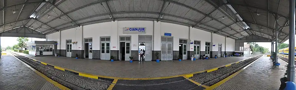 Cianjur Station initially had six railway tracks, including a track to the warehouse opposite the station. Since most of the Jakarta–Bandung cross trains operate via the Cikampek–Padalarang railway, the number of tracks at this station is reduced to three due to lack of traffic.[4][3] The station built by Staatsspoorwegen has now been designated as a cultural heritage by the Central Unit for Conservation and Architectural Design of Kereta Api Indonesia.