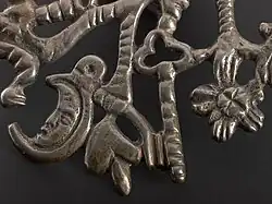 The cimaruta ("chee-mah-roo-tah"; plural cimarute) is an Italian folk amulet or talisman, traditionally worn around the neck or hung above an infant's bed to ward off the evil eye (Italian: mal'occhio). Commonly made of silver, the amulet itself consists of several small apotropaic charms (some of which draw upon Christian symbolism), with each individual piece attached to what is supposed to represent a branch of rue—the flowering medicinal herb for which the whole talisman is named, "cimaruta" being a Neapolitan form of cima di ruta: Italian for "sprig of rue".[1]