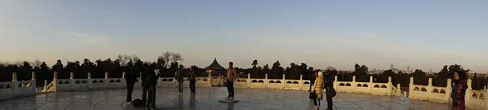 It was constructed in 1530, during the 9th year of the Jiajing Emperor's reign in the Ming dynasty,[1] and enlarged in 1749 (the 14th year of the Qianlong Emperor's reign in the Qing dynasty). The round terrace was first covered with deep blue glazed slabs surrounded with a white marble balustrade when it was expanded. It has a circular perimeter of 534m and a height of 5.2m.