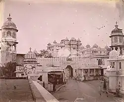 The earliest royal structure he built here was the Royal courtyard or 'Rai Angan',[11][12][13] which was the beginning of the building of the City Palace complex. The court was built at the location where the hermit had advised Maharana to build his new capital.[10][11][12][13][14]