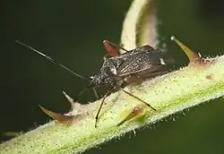 Nymphs can be found in June, while adults are present from late June up to September. These plant bugs are polyphagous, feeding on several species of trees and shrubs. They mainly feed on blackberries (Rubus sp.), birch (Betula sp.), hazelnut (Corylus avellana), common honeysuckle (Lonicera periclymenum), blueberry (Vaccinium myrtillus), common ash (Fraxinus excelsior) and also on small insects. They overwinter as eggs, with just one generation per year.