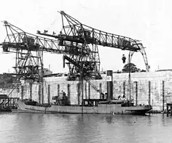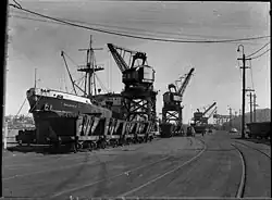 The Carrington coal port used twelve hydraulic cranes powered by water under pressure supplied from a pumphouse nearby.[105] There were also three steam cranes, which had been relocated from Queens Wharf.[60] In 1890, this government-operated facility was capable of loading a total of 12,000 tons per day. The first electric cranes were commissioned at the Basin, in 1916, but at the end of that year needed to be shutdown for a short time, while the power supply was improved. By mid 1917, there were six electric cranes there.[106][107][108]