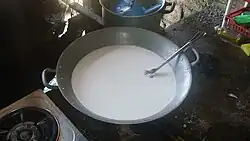 In the Philippines, coconut milk can also be further processed into coconut caramel and coconut curds, both known as latík.[3][43] The coconut caramel latík made from a reduction of muscovado sugar and coconut milk has been developed into a commercial product marketed as coconut syrup (not to be confused with coconut sugar derived from coconut sap).[17][44]
