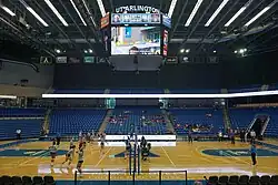 College Park Center is divided into two concourses. The lower surrounds the court/performance area while the upper section is shaped like a horseshoe. For end stage concerts, CPC can seat 6,400 spectators, with the lower bowl seating 3,600.[8] A 2,800-square-foot (260 m2) hospitality suite, divisible into three private sections is above the lower sections opposite the scorers table. The center-hung scoreboard is a four-sided Daktronics 13' X 9' with LED displays while an end-hung scoreboard is an 11' X 19' Daktronics LED display. Two LED display ribbon boards circle the bottom of the balcony seating. At the scorers table are four Daktronics LED display tables linked together to display messages and advertising.[9]