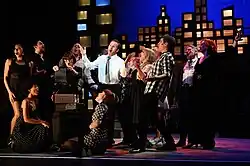 Directed by Hal Prince, the musical opened on Broadway at the Alvin Theatre on April 26, 1970, and closed on January 1, 1972, after 705 performances and 12 previews.[12][13] The opening cast included Dean Jones, who replaced Anthony Perkins early in the rehearsals, Donna McKechnie, Susan Browning, George Coe, Pamela Myers, Barbara Barrie, Charles Kimbrough, Merle Louise, Beth Howland, and Elaine Stritch.[14] Musical staging was by Michael Bennett, assisted by Bob Avian. The set design by Boris Aronson consisted of two working elevators and various vertical platforms that emphasized the musical's theme of isolation.[12]