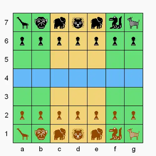 The starting setup is as shown. White (brown pieces in the diagram) moves first. Players alternate turns; there is no passing. The game is won by capturing the opponent's lion. The game immediately ends when a lion has been captured.