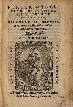 - ^ Bragantini, Renzo (2008). "The Serendipity of the Three Princes of Serendib : Arabic Tales in a Collection of Italian Renaissance Short Stories". Le Répertoire narratif arabe médiéval, transmission et ouverture, Actes du Colloque international, université de Liège (15 septembre 2005), édités par F. Bauden, A. Chraïbi et A. Ghersetti, Genève, Droz: 301–308.