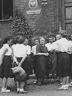 The school soon returned to pre-war scale; in 1946 there were 730 girls enrolled.[50] Initially education adhered to different formulas, resulting in age of students ranging from 11 to 28.[51] The curriculum was unified in 1948, when the establishment was formally turned from Państwowe Gimnazjum i Liceum Żeńskie into Szkoła Ogólnokształcąca Stopnia Licealnego. In line with the nationwide framework of an 11-year general education scheme, the establishment offered schooling in 4 highest grades.[52] Mounting political pressure introduced new rituals,[53] modifications of curriculum,[54] left-wing youth organizations[55] and staff changes,[56] which in the late 1940s resulted in totally new profile of the institution. It is not clear whether the school met expectations of the schooling board; on the one hand, control results were far from satisfactory[57] and there are news of some conspiracy groupings among the girls,[58] on the other, the school got Ministry of Education awards.[59] The new policy climaxed after 1954, when Dąbrówka was renamed to VII Liceum Towarzystwa Przyjaciół Dzieci.[60] In wake of the 1956 political thaw both scouting[61] and religious instruction[62] re-appeared in school; in 1957 Dąbrówka returned to its traditional name.[63]