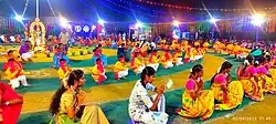 Kolattam is an ancient folk dance usually performed by women with Kol meaning "stick" in Tamil.[58][59][60] The dance uses two small sticks, one in each hand.[61] The dancers generally stand in a circular formation and beat the sticks to make specific rhythms while singing songs.[61][60] The dancers may beat the sticks in their own hands or with the sticks held by other dancers.[58] The dancers may form multiple circles with dancers changing pairs with the members of adjacent circles to make the beats.[62] The dance is usually dedicated to gods or goddesses.[61] The dance is performed during the harvest season and for a fortnight in the Karthigai month of Tamil calendar.[58] There are different variants such as pinnal kolattam and chakke kolattam.[61] Pinnal kolattam uses ropes instead of sticks.[58] Kummiattam is a folk dance similar to Kolattam, with the difference being that hands are used to make sounds while dancing in kummiattam instead of sticks used in the later.[63] The dancers form a rhythm by clapping the hands in different postures.[64] The dance is performed during religious ceremonies, functions and festivals such as Pongal, generally by women.[65][47] There are various types of the dance depending on the occasion or objects used such as poonthotti kummi, deepa kummi, kadir kummi and mulaipuri kummi.[66]