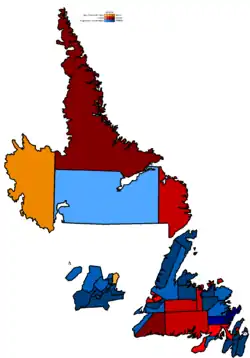 After the vote count, the Progressive Conservatives emerged with nine more seats than they held at the dissolution of the previous legislature. The party had won 69.5 percent of the popular vote, the highest popular vote share ever attained by the PC party in the province. Three Liberal incumbents, as well as NDP leader Lorraine Michael, successfully held their seats.[38] Notably, however, Liberal leader Gerry Reid was not reelected in his own district.[39] The next month Williams' Progressive Conservatives increased their seat count to 44 out of 48, after winning a deferred election in Grand Falls-Windsor-Buchans following the death of Liberal candidate Gerry Tobin on October 1.[40][41]