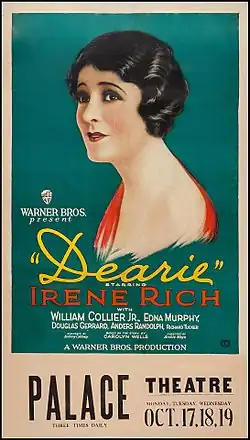 Dearie is a 1927 American silent drama film produced and distributed by Warner Bros. and directed by Archie Mayo.[1] It is from a story by Victorian author Carolyn Wells about a woman who sacrifices for her ungrateful son. This film starred Irene Rich[2] and it is possible that the film may have been released with a Vitaphone soundtrack.