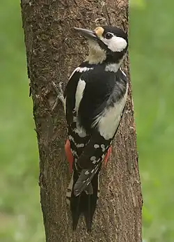 The great spotted woodpecker (Dendrocopos major) is a medium-sized woodpecker with pied black and white plumage and a red patch on the lower belly. Males and young birds also have red markings on the neck or head. This species is found across the Palearctic including parts of North Africa. Across most of its range it is resident, but in the north some will migrate if the conifer cone crop fails. Some individuals have a tendency to wander, leading to the recolonisation of Ireland in the first decade of the 21st century and to vagrancy to North America. Great spotted woodpeckers chisel into trees to find food or excavate nest holes, and also drum for contact and territorial advertisement; like other woodpeckers, they have anatomical adaptations to manage the physical stresses from the hammering action. This species is similar to the Syrian woodpecker.