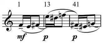 Defined by the head motif and its repetition in bar 3, is "characterized by its relative pitch content (a three-note segment of the semitonal scale), by its interval order—down a half step and up a whole step—and by its rhythm (two sixteenth-notes on the beat followed by a tied eighth-note). This definitive version of the motive, combining all three attributes, occurs at only three different points (not counting the repetition in bar 3), each initiating a new and major formal subdivision of the piece."[12]