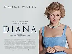 Diana is a 2013 biographical drama film directed by Oliver Hirschbiegel and written by Stephen Jeffreys. Naomi Watts stars as Diana, Princess of Wales, with Naveen Andrews, Douglas Hodge, and Geraldine James in supporting roles.[5]