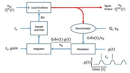 To understand the action in the block diagram, consider the values and to be made up of their average values plus the deviations from the average. The value of (with averages taken over one cycle, ) gives rise to proper feedback operation, locking the frequency of the local oscillator to that of the discriminator, . Additionally, high frequency components of are smoothed by integration and sampling, giving rise to the already known short-term stability limit.[4] However, the term , while generating additional high-frequency noise, also gives rise to very low frequency variations. This is the aliasing effect that causes the loop to improperly correct the local oscillator and which results in additional low frequency variation in the output of the frequency standard.