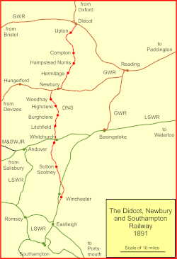 The Didcot, Newbury and Southampton Railway (DN&SR) was a cross-country railway running north–south between Didcot, Newbury and Winchester. Its promoters intended an independent route to Southampton and envisaged heavy traffic from the Midlands and North of England to the port, but they ran out of funds to complete the line to Southampton. The intended heavy through traffic never materialised, and the line was dependent on larger railways—the Great Western Railway and the London and South Western Railway—for support, which was not freely given. The line opened in two stages, in 1882 and 1885.