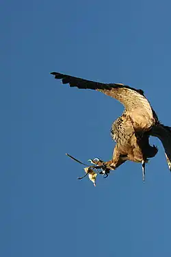 Additional large raptors, i.e. those that can average 1,000 g (2.2 lb) or more in body mass, taken as prey include the 1,080 g (2.38 lb) red kites (Milvus milvus) from the genus Milvus , and the rough-legged buzzards (Buteo lagopus) and saker falcons (Falco cherrug), in both of which females average more than 1,000 g (2.2 lb).[2][61][154][155][156][157] The taking of rough-legged buzzards and snowy owls must be confined to full-grown victims, since they nest further north than Eurasian eagle-owls.[2] Though uncommon, eagle-owls can prey on even larger raptors, such as osprey (Pandion haliaetus), lesser spotted eagle (Clanga pomarina), short-toed eagles (Circaetus gallicus), and Egyptian vulture (Neophron percnopterus).[17][128][119] Even fledgling of Bonelli's eagles (Aquila fasciata) and nestling of white-tailed eagles (Haliaeetus albicilla) are known to be preyed upon.[158] Additionally Eurasian eagle-owls also hunt the smallest raptors available, including those such as lesser kestrels (Falco naumanni) and Japanese sparrowhawks (Accipiter gularis) that weigh less than 150 g (5.3 oz).[89]