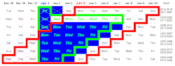 — Each table line represents the period around the New Year when January 1 falls on a specific weekday, and hence the start of the weekday counting.