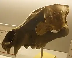 Animal fossils recovered in the same sediments as the hominin remains demonstrate that Pleistocene Dmanisi would have been home to a highly diverse fauna,[31] including pikas,[75] lizards, hamsters, tortoises, hares, jackals and fallow deer.[10] Most of the animals found are Villafranchian (a European land mammal age) mammals and several extinct species are represented, including Megantereon megantereon and Homotherium crenatidens (both saber-toothed cats), Panthera gombaszoegensis (the European jaguar), Ursus etruscus (the Etruscan bear), Equus stenonis (the Stenon zebra), Stephanorhinus etruscus (the Etruscan rhinoceros), Pachystruthio dmanisensis (the giant ostrich), deer Cervus perrieri and Cervidae cf. Arvernoceros, the hyena Pliocrocuta perrieri, rodents Mimomys tornensis, M. ostramosensis and Kowalskia sp., Gazella cf. borbonica (the European gazelle), the goat-antelope Soergelia sp., the bison Bison georgicus and the giraffe Giraffidae cf. Palaeotraginae.[77] The co-occurrence of so many large carnivores; Megantereon, Homotherium, Panthera and Pliocrocuta, highlights that the environment must have been quite diverse.[75] Carnivore activity might account for the fact that all of the hominin skulls were found within just a few square metres of each other.[14]
