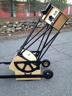 Since the 1990s, manufactured Dobsonians using the truss tube design have become increasingly popular. The first commercial truss Dobsonian was released into the market by Obsession Telescopes in 1989.[21] Later American manufacturers included StarStructure,[22] Webster Telescopes,[23] AstroSystems,[24] Teeter's Telescopes,[25] Hubble Optics,[26] Waite Research,[27] and New Moon Telescopes.[28] These low-volume builders offer premium objective mirrors, high-end materials and custom craftmanship, as well as optional computer controlled GoTo systems. Some also produce "ultra-light" models that offer greater portability.[29]