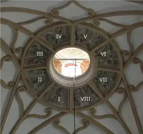 In the corners of the ceiling of the main chapel are two squinches with shell alcoves, in which the arms of the priory's patrons Rodrigo Messía and Mayor de Fonseca are depicted again, flanked by angels. Above them are two pairs of virtues: Strength and Justice over the shield of Messía, and Faith and Charity over that of Fonseca. Covering the eastern end of the chancel is a quarter-spherical vault in which an extensive iconographic scheme is represented in individual coffers, including virgin saints, martyrs of antiquity, prophets and other characters from the Old Testament, the Fathers of the Latin Church and the saints of the Order.[5] Presiding over the altar is a beautiful fresco of Saint Dominic, the order's founder, and above it the arms of the Dominican Order flanked by two greyhounds carrying torches in their jaws, the emblems of Saint Dominic.