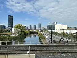 In October 2016, the city of Toronto announced the creation of a 200 acres (81 ha) Don River Valley Park that will stretch for 7 kilometres (4.3 mi) from the West Don Lands up to approximately Todmorden Village in the north.[27] The park will have three zones, an urban zone from West Don Lands to Riverdale Park, a park zone from Riverdale north to Bloor and finally a natural zone for the remaining section to Todmorden Village. Trails for biking and pedestrian use will be connected from existing ones for recreational and transportation needs.[27] Another aim for the park is restoration of land and the upper sections of the Don River.[27] The project aims to revitalize the ravine space through a series of projects that will advance the priorities set out in the city of Toronto's Lower Don Trail Master Plan, prepared by DTAH.[28][29] Together with a series of accessible new entry points, the Master Plan calls for the reclamation of former green spaces throughout the valley, including the former snow dump site north of the Bloor Viaduct.[28] Naturalized ecological conditions throughout the valley would offer improved flood protection. A "nature-inspired" public art program is set to launch in 2017, aiming to strengthen the cultural presence of the Don Valley, which—according to the Master Plan—already serves as a de facto backyard to some 250,000 Torontonians.[28] This new park will be under the management of the Toronto Parks, Forestry and Recreation Division. In 2018 City Council directed staff to consult community about naming the network of parks in the Lower Don "Wonscotonach Parklands", with Wonscotonach meaning "black burnt grounds" or "area previously swept by fire", deriving as an Anglicized form of the name "Waasayishkodenayosh" meaning "burning bright point" or "peninsula" in Anishinaabemowin.[30][31]