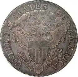 Bullion deposits continued to decline, and in 1797, silver dollar production reached the lowest point since 1794 with a mintage of just 7,776 pieces.[12] During this time, silver deposits declined to such an extent that Thomas Jefferson personally deposited 300 Spanish dollars in June 1797.[13] In April 1797, an agreement was reached between the Mint and the Bank of the United States.[14] The Bank agreed to supply the Mint with foreign silver on the condition that the Bank would receive their deposits back in silver dollars.[14] The Mint was closed between August and November 1797 due to the annual yellow fever epidemic in Philadelphia; that year's epidemic took the life of the Mint's treasurer, Dr. Nicholas Way.[15] In November 1797, the Bank deposited approximately $30,000 worth of French silver.[14] In early 1798, the reverse was changed from the small, perched eagle to a heraldic eagle similar to that depicted on the Great Seal of the United States.[14] The agreement reached with the Bank of the United States along with other bullion depositors (including Boudinot) led to an increase in the number of silver dollars coined;[14] mintage for both the small and heraldic eagle types totalled 327,536.[16] Mintage numbers for the dollar remained high through 1799, with 423,515 struck that year.[17]