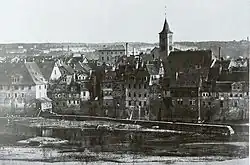 At the location of the present church, in Sachsenhausen on the Main, across the river from the Frankfurt Cathedral, a hospital chapel was consecrated to the Three Kings (Drei Könige) in 1340.[1] The three Kings were the patron saints of travellers, and suitable for a city at the trade road along the Main.[2] The church was a simple hall church with two naves in Gothic style.[2][3]: 15 For a long time, the priests came from the Cathedral parish, which meant that no priest was available during the night when the gates of the city were closed. In 1452, the Dreikönigs parish finally became independent, and the church a filial church.[2][4]