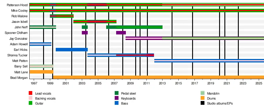 The band currently consists of Mike Cooley (lead vocals, guitar, banjo), Patterson Hood (lead vocals, guitar), Brad Morgan (drums), Jay Gonzalez (keys, guitar, accordion, backing vocals), and Matt Patton (bass guitar, backing vocals). The line-up has undergone multiple changes since the band's formation, with Cooley and Hood serving as the sole constants throughout.[3] The band's constant touring has developed a dedicated following.[4]