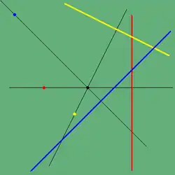 Specifically, in the projective plane, PG(2, K), with K a field, we have the correlation given by: points in homogeneous coordinates (a, b, c) ↔ lines with equations ax + by + cz = 0. In a projective space, PG(3, K), a correlation is given by: points in homogeneous coordinates (a, b, c, d) ↔ planes with equations ax + by + cz + dw = 0. This correlation would also map a line determined by two points (a1, b1, c1, d1) and (a2, b2, c2, d2) to the line which is the intersection of the two planes with equations a1x + b1y + c1z + d1w = 0 and a2x + b2y + c2z + d2w = 0.