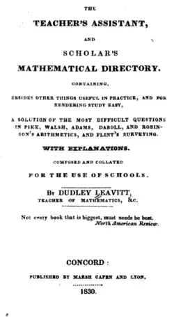 - The Teacher's Assistant, and Scholar's Mathematical Directory, Dudley Leavitt, published by Marsh, Capen and Lyon, Concord, 1830