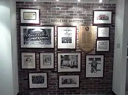 The Gardens was demolished in 1956 to make way for an apartment building[11] and a local fixture, Stouffer's Restaurant.[3] Stouffer's, which became Duranti's Restaurant in 1979, featured the only remaining evidence of the Gardens, two 11-foot wide sections of exposed red brick wall, which would have been the back wall of the Gardens' visiting dressing room. Duranti's then closed in December 2008 and the apartment building that replaced the Gardens was to be torn down and renovated. Jim Kubus, the editor of pittsburghhockey.net, a local history site, and his brother removed the bricks before the wall could be destroyed and stored them for the next two years. Today, a Captain Morgan-sponsored lounge, which is located inside Pittsburgh's current multi-purpose arena, the PPG Paints Arena, contains a small section of that particular wall from the Duquesne Gardens.[11] Billy Conn, the famed Pittsburgh boxer who nearly won a match against Joe Louis, fought at the Gardens. On June 18, 1998, the intersection where the Gardens once stood was dedicated as "Billy Conn Blvd."[6]