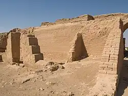 The Dura-Europos church (or Dura-Europos house church) is the earliest identified Christian house church.[1] It was located in Dura-Europos, Syria, and one of the earliest known Christian churches.[2] It is believed to have been an ordinary house that was converted to a place of worship between 233 and 256 AD, and appears to have been built following the Durene tradition, distinguished by the use of mud brick and a layout consisting of rooms encircling a courtyard, which was characteristic of most other homes built in the Dura-Europos region.[3] Prior to the town being abandoned in 256 during the Persian siege, the Romans built a ramp extending from the city wall which buried the church building in a way that allowed for the preservation of its walls, enabling its eventual excavation by archaeologists in 1933.[4][5][6] It was less famous, smaller, and more-modestly decorated than the nearby Dura-Europos synagogue, though there are many similarities between them.