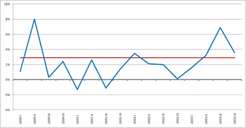GDP growth of the US from 2000–2002. Note the lack of two consecutive negative quarters. The profile matches that of a U shaped recession with growth remaining weak from 2000-III to 2003-I.