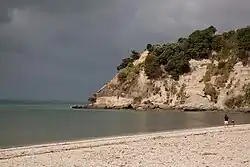 Eastern Beach is located on the eastern side of a peninsula between the Tāmaki River and the Tāmaki Strait of the Hauraki Gulf, on the opposite side to Bucklands Beach.[6] The beach looks out towards the Tāmaki Strait and Waiheke Island.[7] The area is primarily formed from Waitemata sandstone. Anticline folding of the layers of sandstone can be seen along the cliffs of the beach, and Macleans Reserve is the location of a chenier plain, a large bed of fossilised shells.[8]