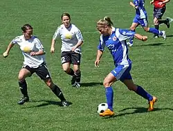 The foundation for the club's later success was laid in the 1993–94 season when former captain Monika Staab, as coach and head of the women's football division, and Siegfried Dietrich, as manager and investor, developed the first professional club model in German women's football.[1] The club qualified for the playoffs for the German football championship for the first time in 1995–96, losing the final 0–1 to TSV Siegen.[2] In the following seasons they managed to stay amongst the top clubs in German football, but won no titles, often behind local rival FSV Frankfurt.