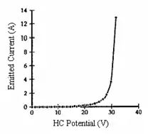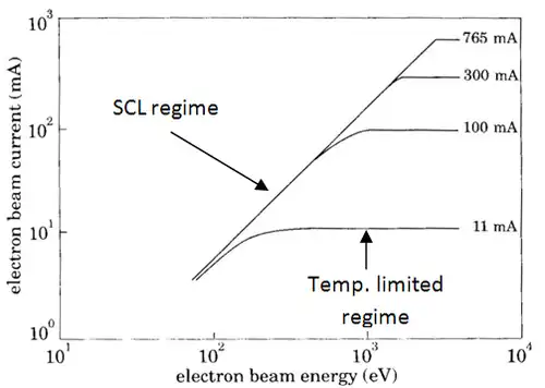 TC electron emission will occur in one of two different regimes: temperature or space charge limited current flow. For temperature limited flow every electron that obtains enough energy to escape from the cathode surface is emitted, assuming the acceleration potential of the electron gun is large enough. In this case, the emission current is regulated by the thermionic emission process, given by the Richardson Dushman equation. In SCL electron current flow there are so many electrons emitted from the cathode that not all of them are accelerated enough by the electron gun to escape the space charge. In this case, the electron gun acceleration potential limits the emission current. The below chart displays the temperature limiting currents and SCL effects. As the beam energy of the electrons is increased, the total escaping electrons can be seen to increase. The curves that become horizontal are temperature limited cases.