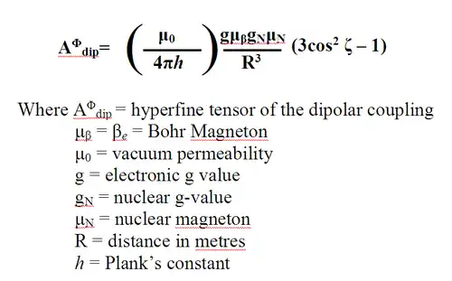 At θ = 0˚ the ENDOR spectra contain only the component of hyperfine coupling that is parallel to the axial protons and perpendicular to the equatorial protons. At θ = 90˚ ENDOR spectra contain only the component of hyperfine coupling that is perpendicular to the axial protons and parallel to the equatorial protons. The electron nuclear distance (R), in meters, along the direction of the interaction is determined by point-dipole approximation. Such approximation takes into account the through-space magnetic interactions of the two magnetic dipoles. Isolation of R gives the distance from the origin (localized unpaired electron) to the spin active nucleus. Point-dipole approximations are calculated using the following equation on the right: