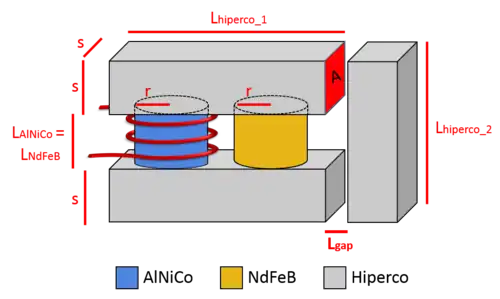 For the calculation of the values of the components in the circuit we will assume that all the areas in the flow have the same dimensions. If the selected magnets had a cylindrical shape then the area of the flow for the magnets will be and the hiperco blocks will have a square section of side in order to have the same area.