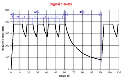 The warning signal is described by décret (by law) of March 23, 2007. It consists in a modulated sound going up and down (up to 380 Hz) during the first minute, and repeated three times. The end of alert is a continuous signal lasting 30 seconds.