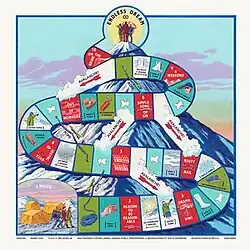 The front cover artwork, depicting the band members looking up at three peaks of a mountain range, follows the consistent motif of having the three band members or three similar objects on each of their album covers. The cover was designed by Frans Enmark and illustrated by Graham Samuels, who had previously illustrated the artwork of their third album Writer's Block.[6] The rear cover artwork for the LP is a functional board-game board illustrated in the same style featuring the tracklisting embedded into the path of the board game.[7]