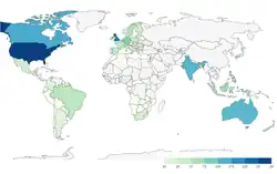 In 2022, for English Wikipedia, Americans accounted for about 40% of active editors, followed by British and Indian editors accounting for about 10% of each, and Canadian and Australian at about 5%.[31]