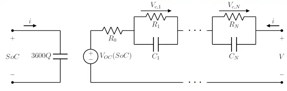 The equivalent circuit model (ECM) is a common lumped-element model for Lithium-ion battery cells.[1][2][3] The ECM simulates the terminal voltage dynamics of a Li-ion cell through an equivalent electrical network composed passive elements, such as resistors and capacitors, and a voltage generator. The ECM is widely employed in several application fields, including computerized simulation, because of its simplicity, its low computational demand, its ease of characterization, and its structural flexibility.[2][4][5][6] These features make the ECM suitable for real-time Battery Management System (BMS) tasks like state of charge (SoC) estimation,[7] State of Health (SoH) monitoring[8] and battery thermal management.[9]