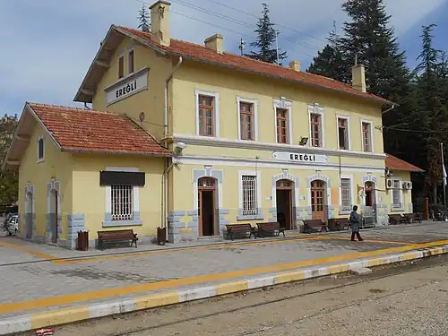 Ereğli Gar is the railway station of the town. Once served by several train lines that have destinations to Istanbul, İzmir and Konya, the station is currently served by Mainline / Toros Ekspresi only, which connects Ereğli to Adana and Karaman.
