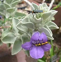 The flowers are borne singly in leaf axils and lack a stalk. There are 5 linear sepals which are 10–15 mm (0.4–0.6 in) long, almost claw-like at the tip and covered with a thick layer of hairs similar to those on the leaves. The petals are 25–35 mm (0.98–1.4 in) long and are joined at their lower end to form a tube. The petal tube and its lobes are lilac-coloured to light purple or blue-mauve, with pale purple spots inside the tube. The outside of the tube and lobes is densely covered with branched hairs, the inside surface of the lobes is glabrous and the inside of the tube is densely woolly. The 4 stamens are fully enclosed in the petal tube. Flowering occurs between June and October and is followed by fruit which are cone-shaped to flask-shaped, 6–7 mm (0.2–0.3 in) long with a hairy covering.[2][3]