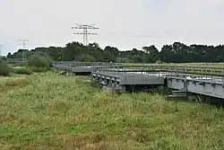 The Saale-Elster Viaduct crosses the floodplains of the Saale and White Elster over a length of 6,465 m (21,211 ft), starting in Schkopau. The building of the longest bridge in Germany through several protected areas was particularly complex due to the Habitats Directive (Council Directive 92/43/EEC), a bird sanctuary and a drinking water protection zone grade III, which together required numerous applications of administrative law. Another special feature of the infrastructure is the grade-separated junction with the link to Halle (Saale) via a 2,112 m (6,929 ft) long viaduct, with a viaduct for the track towards Halle passing under the main viaduct. The branch connects with the existing Halle–Bebra railway at Ammendorf/Beesen.[2] Halle (Saale) Hauptbahnhof is connected to the new line over a link with a total length of 8.9 km (5.5 mi).[3]